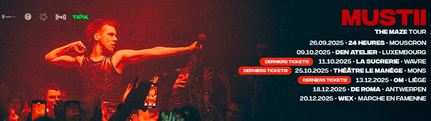 Après avoir enflammé Forest National devant 6.000 spectateurs lors d’un concert d’une intensité rare, Mustii confirme plus que jamais son statut d’artiste incontournable de la scène belge. Sa tournée « The Maze », imaginée comme un véritable voyage sensoriel, réunit près de 4.500 spectateurs à travers cinq dates en club. À chaque représentation, l’artiste livre des performances puissantes, sincères et électrisantes, où émotion et énergie ne font qu’un.
